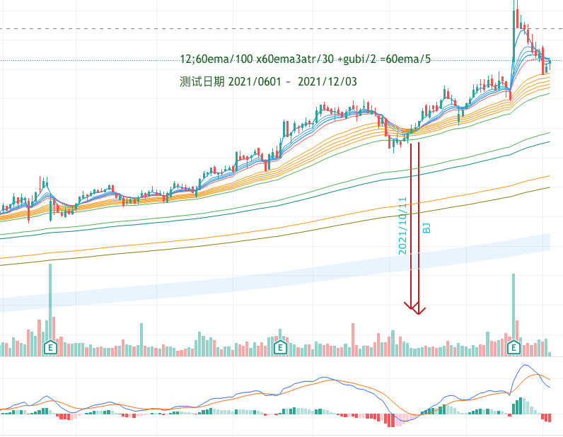 MACD五日内金叉,并且12均线走趋缓。但选出来的结果有点多,需要配合其它指标进一步限制, 如 12;60ema/5 或者 x60ema3.0atr/50 图:BIO金叉进场 2021-10-18