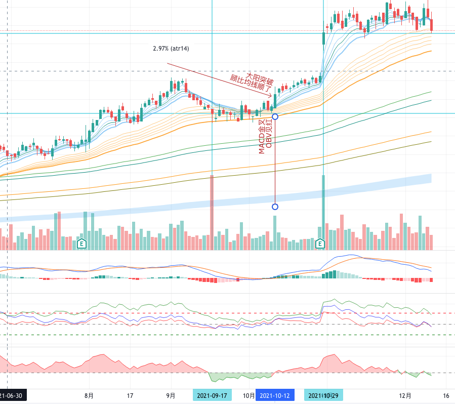 这是VCAR在2021年9月17日到10月12日一段走势。9月17日一条小阴线放了巨量。我们只需要在这个时候关注它就好了。9月29日那根阳线突破的时候,还不能进。