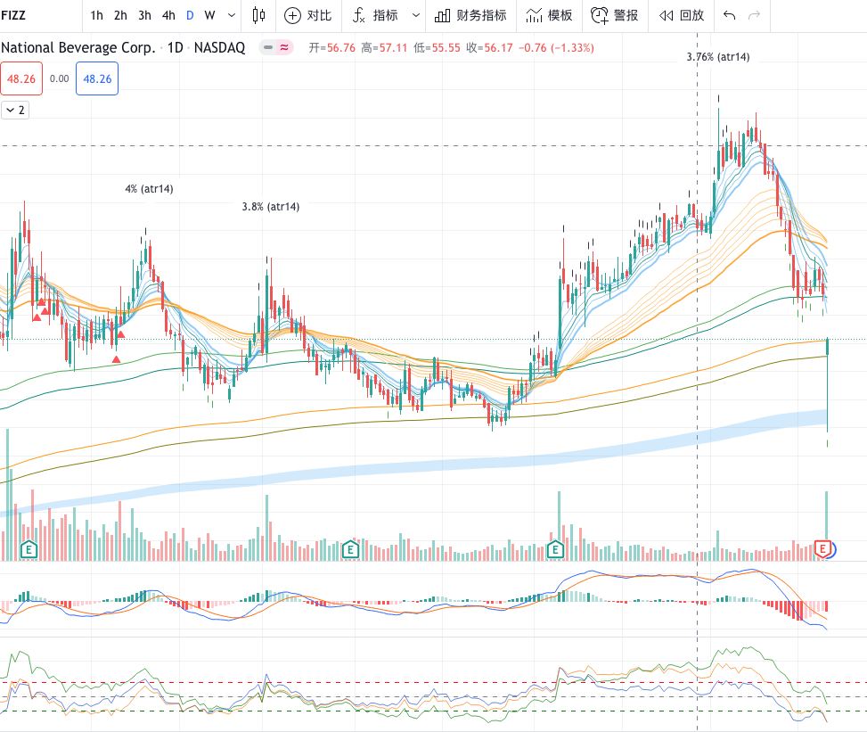 最好观察一到两天,如果都没有跌破长影线的位置,就是很好的入手位。比如FIZZ在2021年12月10日这天因为公布的财报不理想,开盘大跌,长影线收盘。这根长影线最低触及到此轮上涨的起步位置,收盘到338EMA均线。(也就是双隧道系统的隧道2之上。)如果能够在这里站稳,后面会有一波不错的上涨。