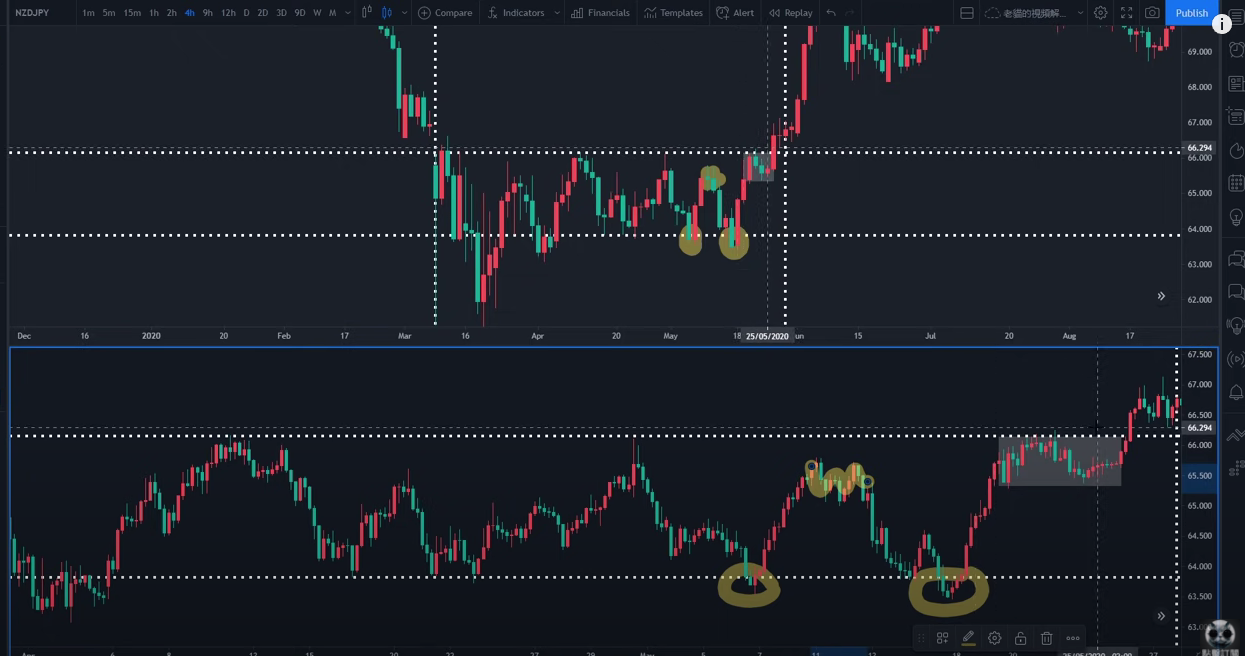 强势上涨后短暂回调,寻求介入位置。在最近一波上涨中,寻找到 HH 的两个高点,分别画出它们的支撑线。如果出现 1/2 和 1/3 重叠。则是非常好的位置。 视频解说